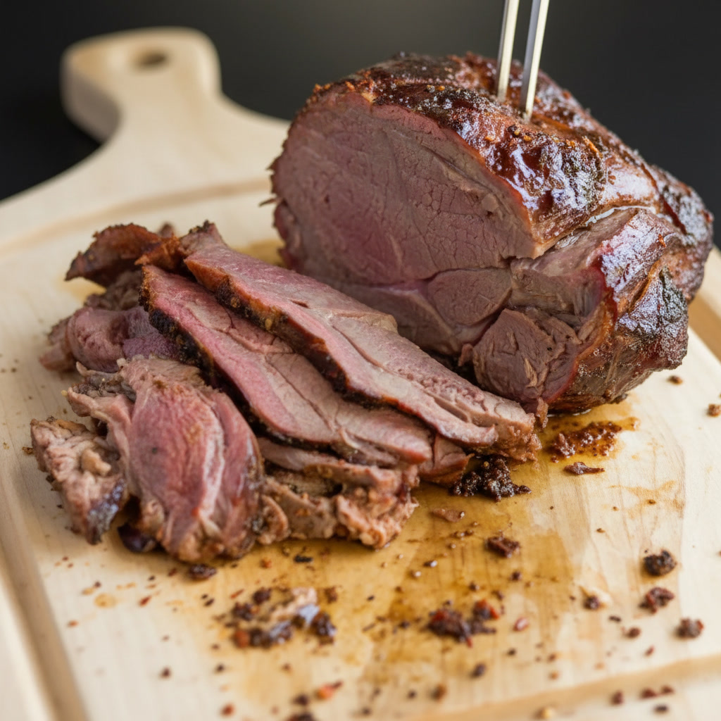 A boneless leg of lamb cooks more evenly because you can tie it into a uniform shape. That alone makes a big difference when you’re trying to hit the right internal temperature from edge to centre. It’s also much easier to season properly, since you can open it up and get seasoning and marinade inside the meat where the bone used to be. And when it’s time to slice? Way simpler. No bone to work around, just clean, even slices.